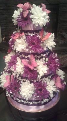 My daughters baby shower theme is butterflies & blooms with purple, pink _ white as the primary colors. This diaper cake is four tiers of size one pampers, each individually rolled & secure with a rubber band. All diapers in each tier is also secured together with larger bands which is covered by the ribbon. The white around the dark purple ribbon is actually tiny white butterflies held in place with small pearl straight pins. On each tier I put purple & white flowers with babys breath & added pink butterflies. This was my first diaper cake I have made & it was very simple to make.