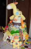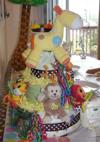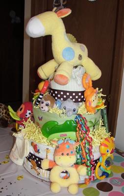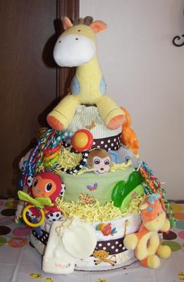 After searching for hours on the internet, I finally came up with a diaper cake that I thought I could put together. The one gal said it right, they are not hard to do. I used a bathtub mat for the middle of mine. It seemed to be the right size. I had some animals from previous occasions so I used those on the cake also. Just about the same ones as the one on the net. I used the FP stickers from Hobby Lobby and some yellow paper for the frosting. Pretty fun all in all! This baby shower is going to be a blast!