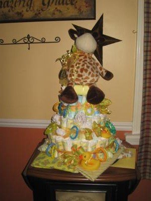 I tucked a comb a brush,a spall container of cue tips rapped like a package with a little bow on it hen tucked it in the side of the cake. I used teathers ,rattles and rubber ducks to decorate and i found chains that connect to each other pulled the colors i wanted and spaced them around the cake. On the last tear I used a bottle brush to and put it in the center to anchor the stuffed animal. Then wrapped a box of baby bottle liners to look like a package and set my giraffe on it and secured it with curl ribbon and made a big bow with the wide ribbon I uses around the cake.
