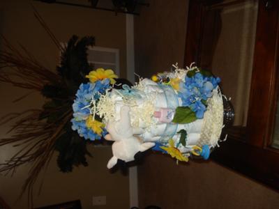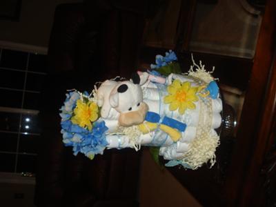 Replace the central diaper from the top tier with a baby bottle, which can be filled with candies. Some more diapers from the remaining tiers can be replaced with other baby related articles such as safety pins, pacifiers, booties and bibs. Take care not to replace too many diapers.