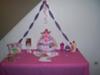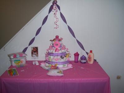 This bright & happy diaper cake is a delightful centerpiece for a girl theme baby shower, as you can see in both photographs above. A diaper cake can bring in the colors of your baby shower, with which you can accent the rest of your decor. So well done!