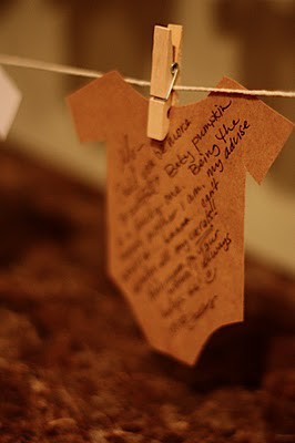PD.: TAMBIEN LES ENVIO UNA LINDA IMAGEN, DE UN PEDAZO DE PAPEL CORTADO EN FORMA DE ROPA DE BEBE DONDE LOS INVITADOS PONEN MENSAJES PARA LA MAMA O EL BEBE! OTRA COSA...EL JUEGO DE LAS FOTOS DE LOS INVITADOS DE BEBES...YO LAS PUSE EN UN DIARIO DONDE LOS INVITADOS AL LADO DE LA FOTO LE ESCRIBIAN AL BEBE MENSAJES HERMOSOS..PARA QUE LE QUEDE DE RECUERDO