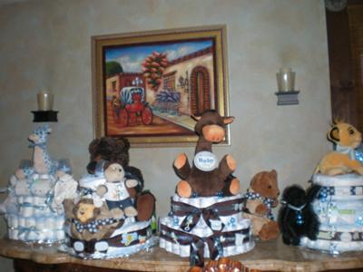 It was my first baby shower and first grandson. I was so inspired that one was not enough and so I made 4 diaper cakes that served as center pieces as well.