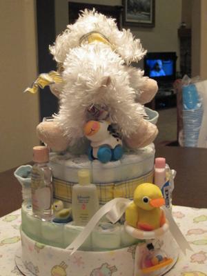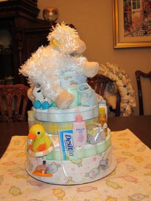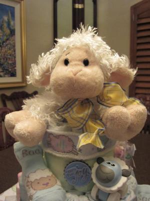 The theme was Lambs and it's hard to find Lamb decorations so I had to do some digging to get lamb items for my 1st diaper cake.